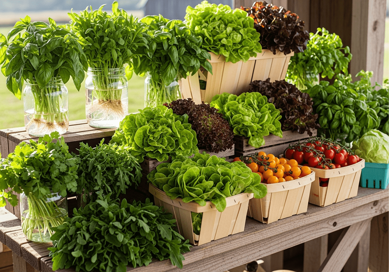 Locally grown hydroponic vegetables and leafy greens harvested at peak freshness. From crisp lettuce and arugula to flavorful herbs and cherry tomatoes.