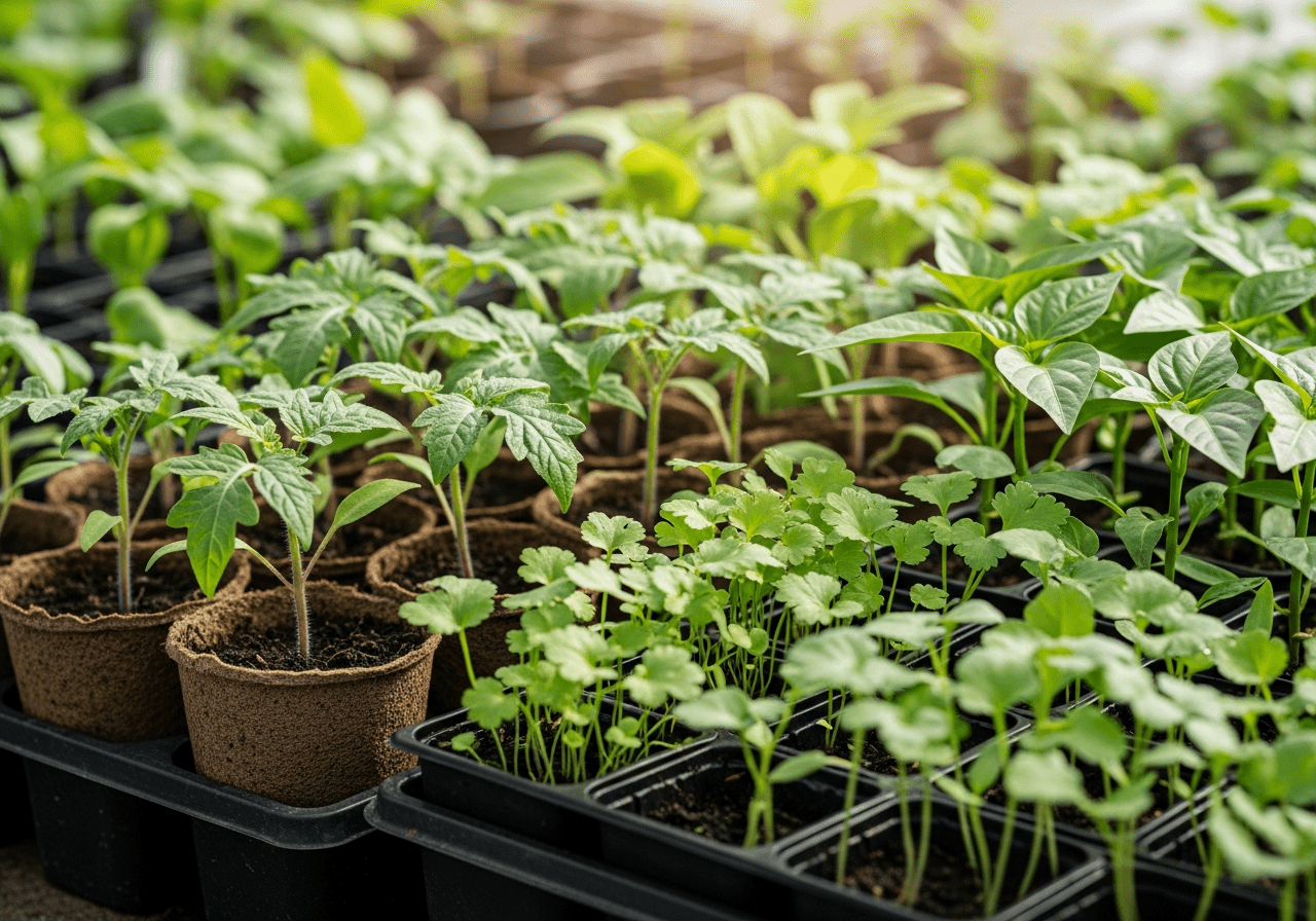 Healthy young vegetable and herb plants ready for your garden. Tomatoes, peppers, herbs, and seasonal varieties grown with care.
